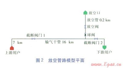 放空管路模型平面見圖2。已知:2個(gè)截?cái)嚅y門間為長(zhǎng)16 km的ø813×13的輸氣干管,流量為2
