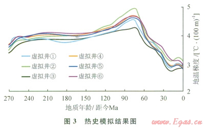 熱史模擬結(jié)果(圖3)表明:南黃海古地溫梯度自二疊系沉積開始至上白堊紀(jì)(距今約70Ma)一直呈上升趨勢,最高至5.0℃/l00m,其間有2次快速升高(距今270~260Ma和130~70Ma)和1個(gè)平穩(wěn)期(距今260~130Ma),平穩(wěn)期地溫梯度在4.0℃/l00m左右,70Ma至今地溫梯度總體呈下降趨勢,現(xiàn)今地溫梯度最低,為3.0℃/l00m左右;在最高地溫梯度處(距今約70Ma),各虛擬井的數(shù)值差別最大,最大差別可達(dá)1.0℃/l00m;新近紀(jì)和第四紀(jì)沉積對古生界烴源巖的深埋增熟作用由于該時(shí)期地溫梯度的降低而減弱。