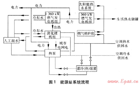 能源站設(shè)1路10kV高壓進(jìn)線(xiàn),燃?xì)獍l(fā)電機(jī)組經(jīng)2臺(tái)容量為2000kVA變壓器升壓后分別接入10kV配電母線(xiàn)與市電并網(wǎng)運(yùn)行,每臺(tái)變壓器各接入1臺(tái)1360kW及1臺(tái)360kW燃?xì)獍l(fā)電機(jī)組。燃?xì)獍l(fā)電機(jī)組采用并網(wǎng)不上網(wǎng)的方式(或獨(dú)立運(yùn)行方式),在10kV進(jìn)線(xiàn)側(cè)設(shè)有逆功率保護(hù)裝置,防止向城市電網(wǎng)送電。燃?xì)獍l(fā)電機(jī)組發(fā)電在生態(tài)園范圍內(nèi)使用,除能源站設(shè)備用電外,用于生態(tài)園的為外供電量,不足部分由城市電網(wǎng)補(bǔ)充。為充分利用城市電網(wǎng)低谷時(shí)段電,并考慮夜間冷熱負(fù)荷較低,通常夜間燃?xì)獍l(fā)電機(jī)組不工作,熱泵利用城市電網(wǎng)低谷電進(jìn)行蓄冷、蓄熱,蓄冷熱裝置采用共用方式。能源站系統(tǒng)流程見(jiàn)圖1。